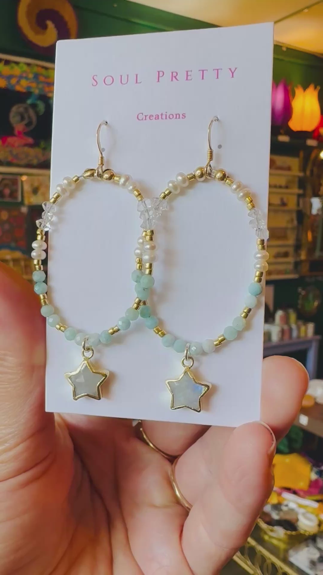 Soul Pretty Moonstone Star + Larimar + Pearl + Herkimer Handmade Gold Fill Earrings